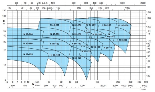 Графік характеристик напор-продуктивність насосів Calpeda N, N4 :