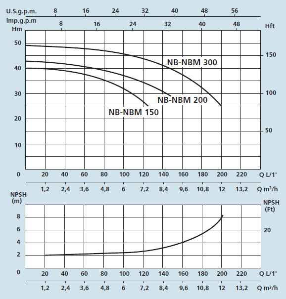 Графік характеристик напор-продуктивність насосів Speroni NB - NBM :