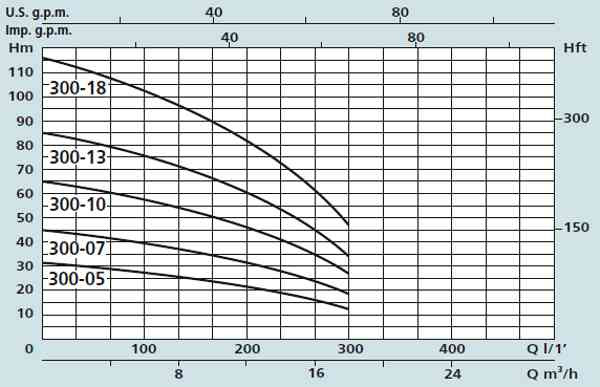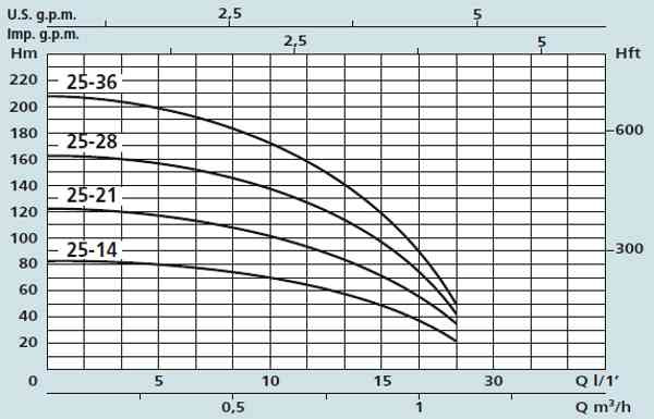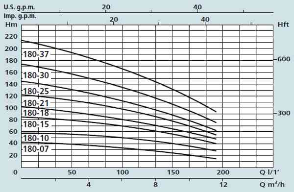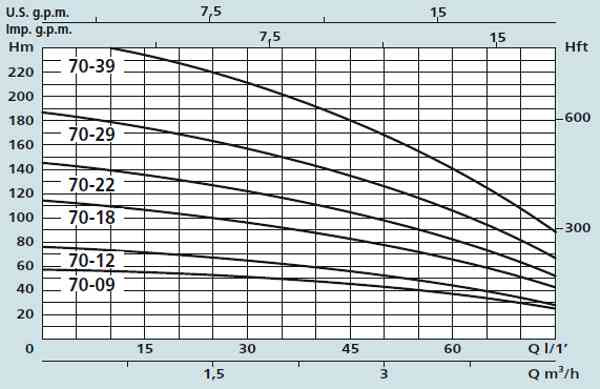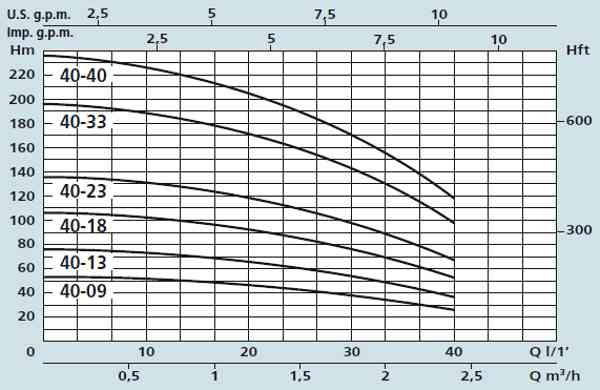 Графік характеристик напор-продуктивність насосів Speroni SX — SXM: