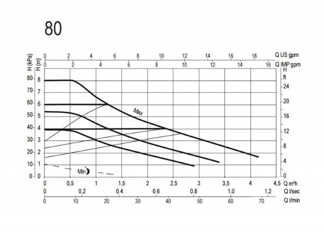 Рабочий диапазон Производительность - от 0,4 до 8,2 куб.м./час, напор - до 6,5 м. водяного столба