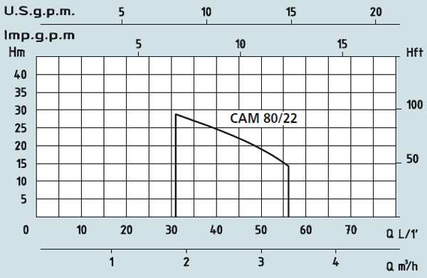 Графік характеристик напір-продуктивність насосів Speroni KS801/22, CAM40/22, CAM80/22, CAM60/25: