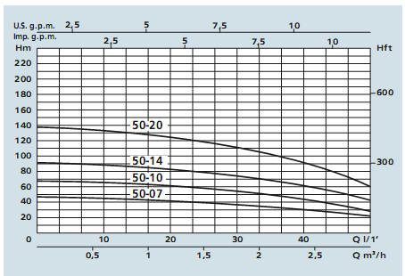 Графік характеристик напор-продуктивність насосів Speroni SPT 50-07 SPT 70-16 S/S, SPT 100-14 S/S, SPТ 140-10 S/S, SPТ 200-08 S/S, SPТ 400-11 S/S: